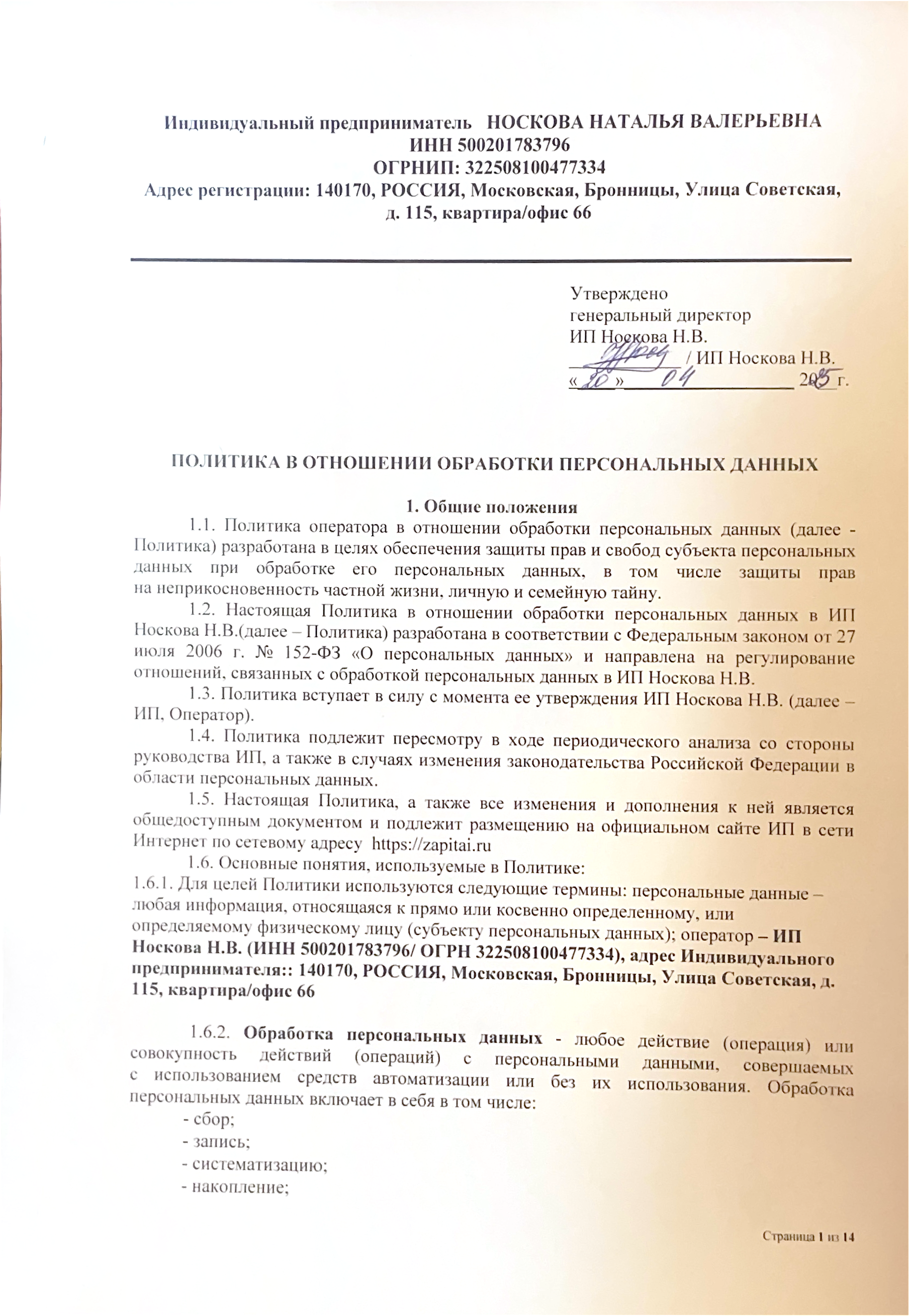1.3. Политика вступает в силу с момента ее утверждения ИП Носкова Н.В. (далее – ИП, Оператор).